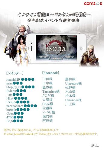「イノティア戦記4〜ベルケルの暗殺者〜」発売記念イベントの当選者を発表致します。当選者の皆様おめでとうございます! また、このたびはご応募いただき、ありがとうございました! カムツス(Com2uS Japan) |